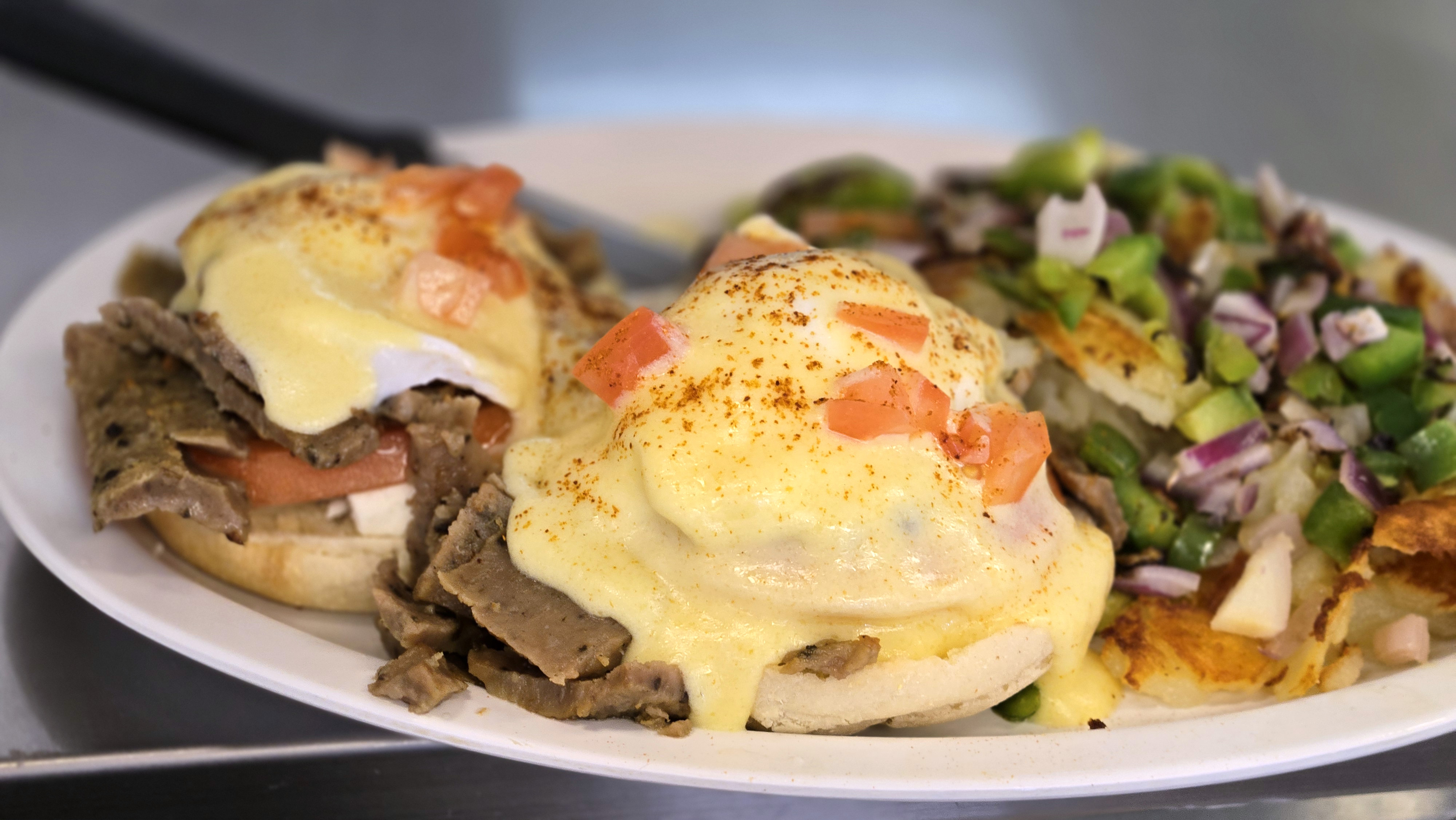 Eggs, cheese and peppered bacon on a toasted bagel. Served with home fries.